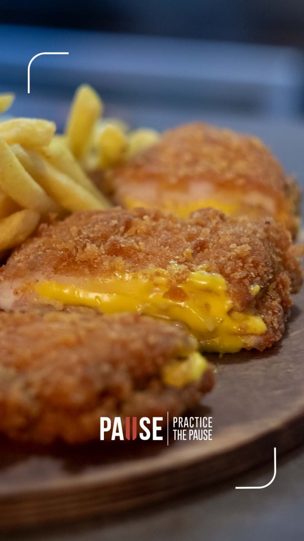 سینه مرغ پر شده با ژامبون گوشت و پنیر گودا به همراه سیب زمینی سرخ شده